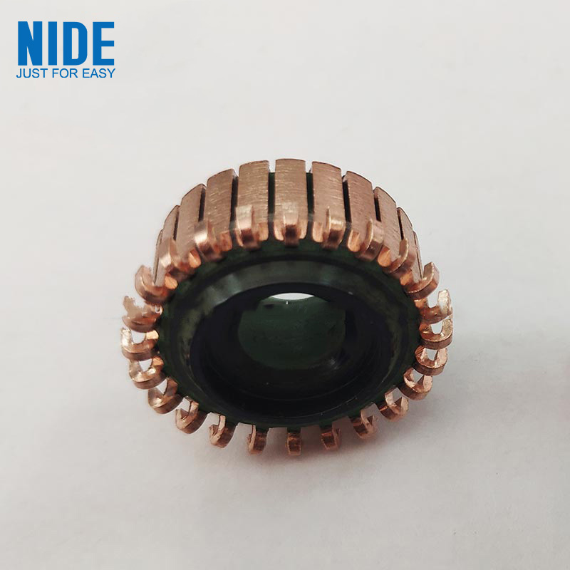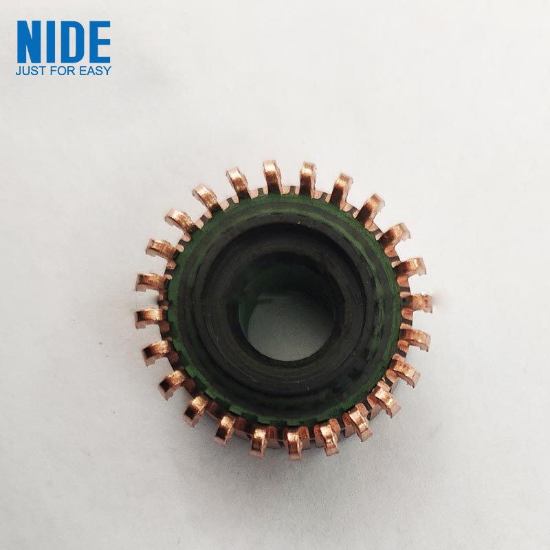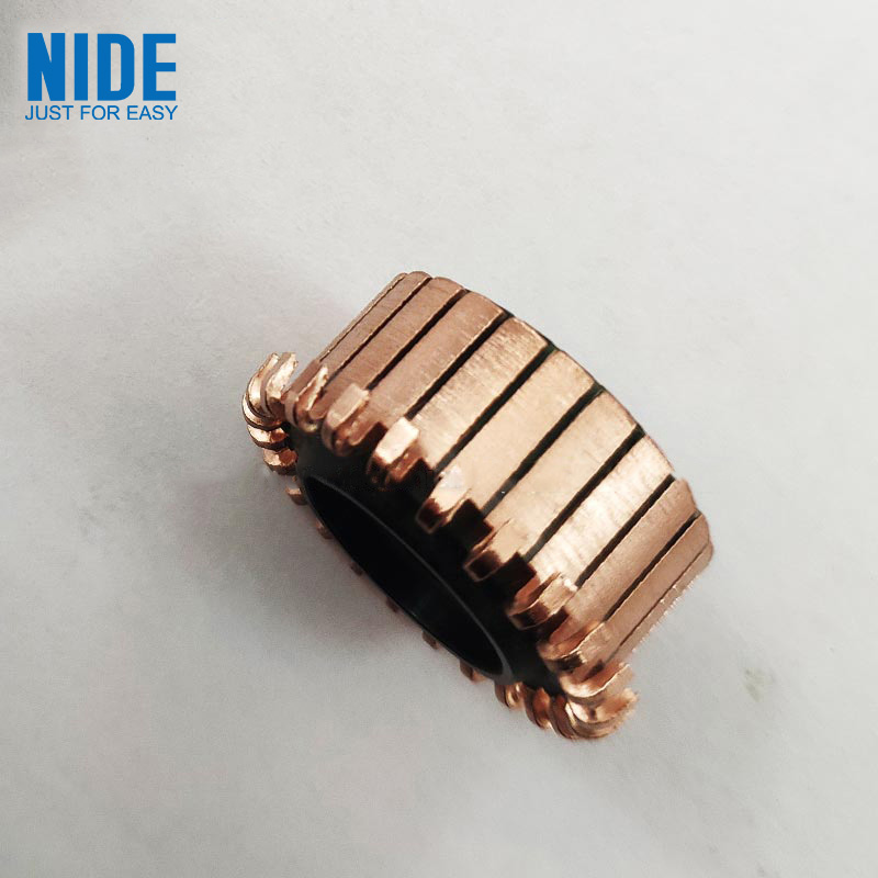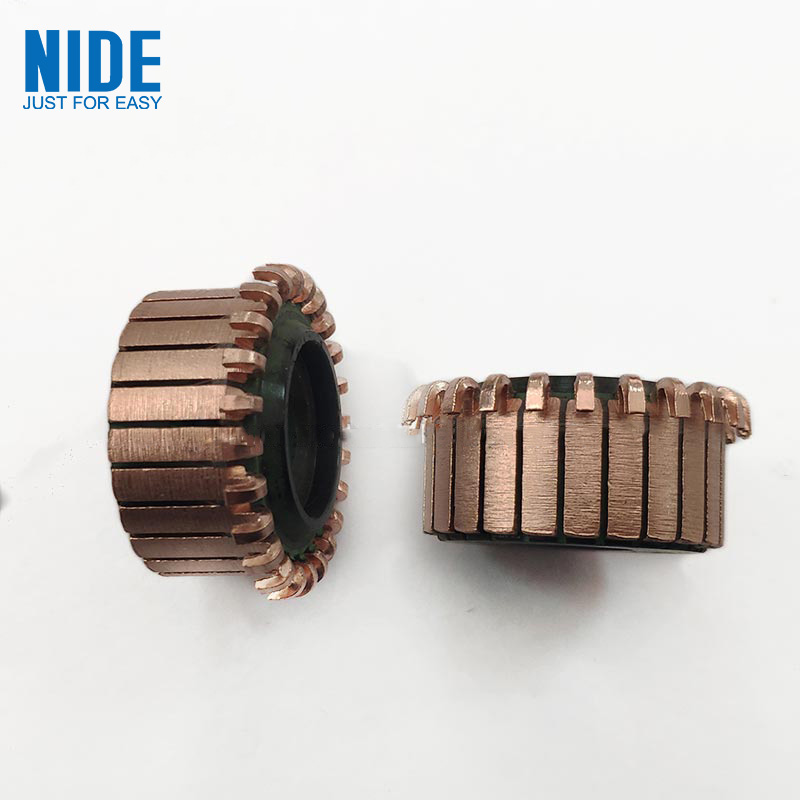De segmenten van de motorcommutator zijn meestal gemaakt van koper en zijn van elkaar gescheiden door mica-isolatie. Het mica wordt zo gesneden dat het onder de koperen segmenten ligt. In de stijgbuis op de commutator zijn sleuven gesneden om het solderen van de uiteinden van de spoelen te vergemakkelijken. Er zijn twee keer zoveel segmenten op de commutator als er sleuven in de gelamineerde kern zijn voor de spoelen.